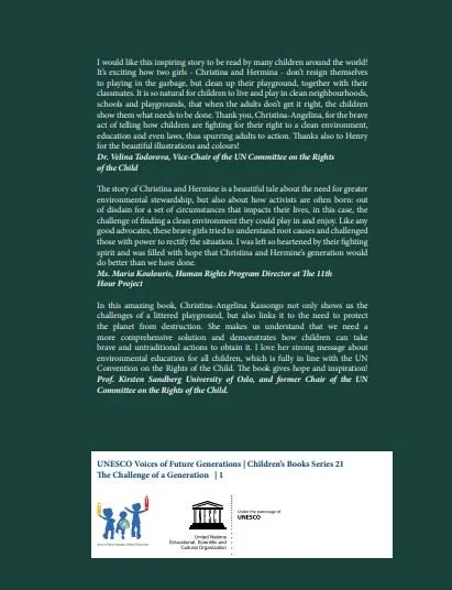 This story written by Christina-Angelina Kassongo exudes her passion for tackling today’s pressing environmental issues not only by her determination to raise awareness about important issues but by her willingness as a young person to take the time to share this story. She helps make the voice of her generation heard. The Voices of Future Generations Children’s Initiative is a seed of hope, creating an outlet for children concerned about the enormity of the world’s problems and helping them find their own voice and seek solutions.