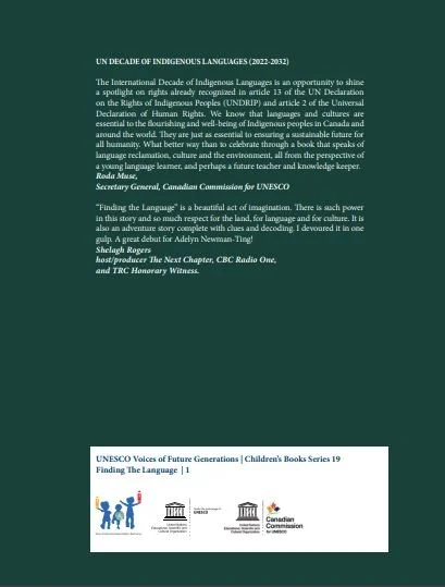 In this beautifully written story by Adelyn Newman-Ting, we are introduced to Kesugilakw (Kesu) and Bob, who have been friends since they were babies. One day they head out to the forest to play and find themselves in a mysterious place. It is in this place that they meet gwa’wina, a raven, and a wolf named u’ligaan, both of whom can talk and who can understand Kesu and Bob. "The animals explain to the two children how the land created Indigenous languages and how both the land and Indigenous languages are at risk. "The four of them become fast friends and develop a plan to raise awareness with other children in the community about the risk to the land and languages. They bring all the children together and share information about UNESCO and the Sustainable Development Goals, specifically Goals 4 and 13. Goal 4 seeks to ensure inclusive and equitable high-quality education and promote lifelong learning opportunities for all, and SDG 13 asks us all to take urgent action to combat climate change and its impacts. Adelyn brilliantly weaves in the importance of the United Nations Declaration on the Rights of Indigenous People. She helps the reader understand the beauty and importance of languages by infusing Kwakwala throughout the story.