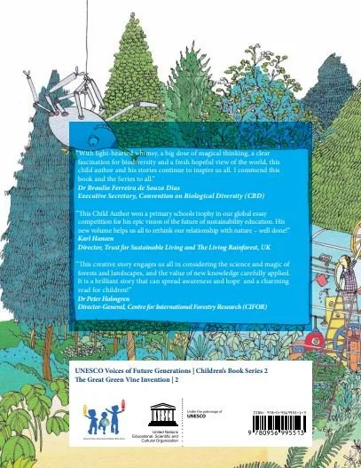The “Great Green Vine Invention” illuminates how children care about growth, what it means, and its limits. Our Child Author offers a vision of development that is in harmony with others and with nature. In the face of a changing climate, the destruction of global resources, the pollution of our environment and injustices in our human family, the younger generation represented in this volume offers a playful, creative voice, which carries hope for a better future. It is a gentle reminder that courage, kindness, innovation and responsibility are the keystones on which civilization flourishes.