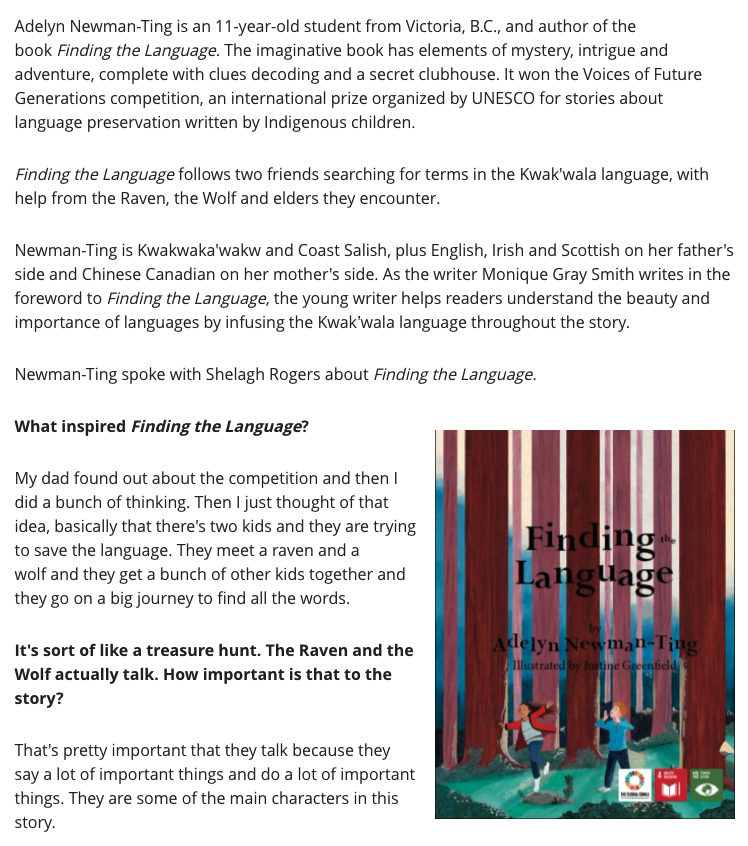 11-year-old B.C. author Adelyn Newman-Ting celebrates Kwakʼwala language in her book Finding the Language