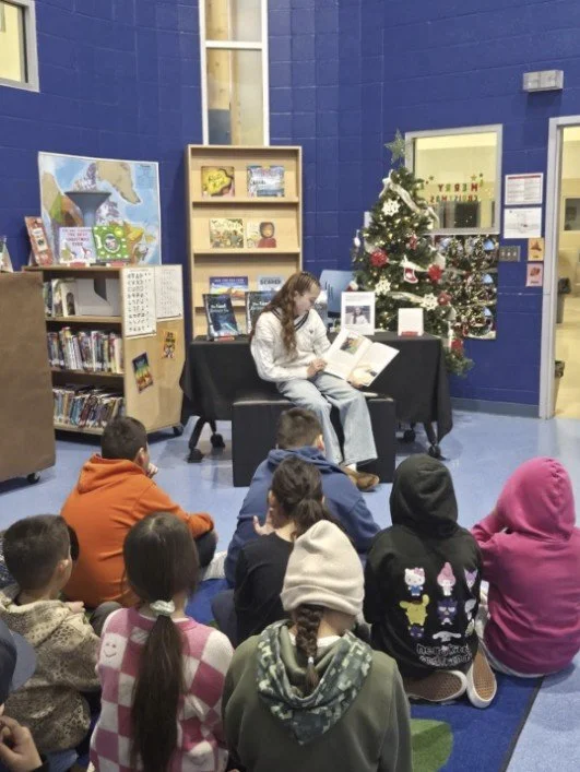 On December 2nd, students in Maskwacis, Alberta, gathered to celebrate young voices and powerful storytelling. Voices of Future Generations (VOFG) newest child author, Vienna Swampy, visited Nipishkopahk Elementary School and Maskwacis Cree High School to sign her first book, The Land Before Us, and connect with readers in her community.