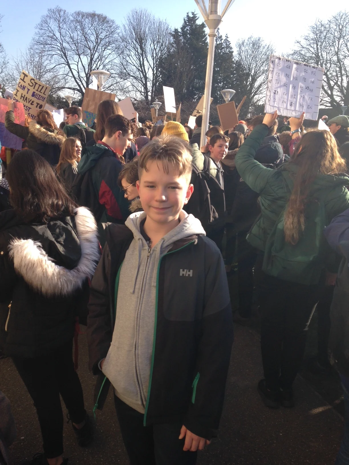 "I'm Jona David from King's College School here in Cambridge. It's brilliant to see so many other pupils out today! I'm a UN child author, and my 4th book is coming out this spring. 'The Cosmic Climate Invention.' I'm speaking against the risks and terrible impacts of climate change today!
